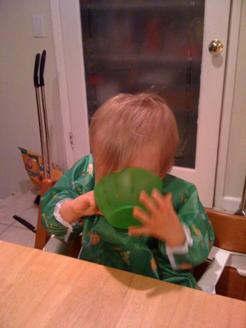 So, here is a pic of him getting every last drop (pea-sized bit) of banana last night. I have resorted to having him wear the full-body armor as otherwise his outfit absorbs almost as much food as he does.